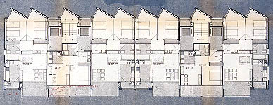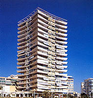In the scale model, which was made by Guardiola himself, it can be seen how the main boulevard of the housing estate development runs behind the development, moving rapid traffic away from the beach. Behind and curving according to the border with the plot, the old road accesses directly to the beach in one trajectory, which according to the planning should become a secondary access ending in a pocket for parking area and surround the housing development, but actually this has always been kept as a roadway with quite a lot of traffic that borders all along the beach up as far as the municipality of El Campello. The complex responds to the singularity of the location with an architecture designed with much attention to detail and in which the typological deployment, and the optimal placement of the blocks with the plot generate an island of coherence within the urban stretch. The complex correctly carries out the role of transition between the high rise structures permitted in the zone where it is located and the single family dwellings that were to be built in the adjoining area. For this, Guardiola adopted in two of the buildings lower height typologies that would fit in with the possible volumes that could in the future be built to the south. The curve of the old roadway, then, is faced with a block of two story attached and staggered single family residences, and the facade oriented toward the Cabo de la Huerta (cape) is executed with an imposing block of three story single family residences, also attached. On the other more urban side, which gives off onto the large boulevard behind it, a lineal block with ground floor and six stories has been built in the development. While in the background of the perspective of the old roadway, as can be seen perfectly in the scale model, and playing the role of urban landmark denoting the beginning of the beach, a markedly vertical block has been built, responding exactly to the typology of the singular structure that Guardiola defined in his plan for the first housing estate development in San Juan Beach. These buildings have inherited the emphatic square ground plan, although height has gone from 11 to 17 stories. The individuality of this tower block is potentiated with a formalist approach that we were not accustomed to in previous works of the architect. This represents a facet he would accent little by little in later work, until it was to become one of the most significant aspects of his production of the seventies and the eighties. In this case the formalism is restrained, and is controlled throughout by the general rationality of the design. It is perhaps this equilibrium between form and reason which allows the complex to be susceptible to a criticism of the architecture as well as accepted by the users of the beach as an architecture which is significant of the surrounding area. This fact, which does not always co-exist with good architecture, is undoubtedly one more positive aspect of the design. It would appear that a trip the architect took to Japan shortly before is the origin, certainly very evident, of the formal structure of this tower block, whose construction work inclined pane walls in the form of the bow of a ship have lost their original covering of ceramic pieces. In this design Guardiola breaks with a series of monotonic quantities, in some cases close to being routine, that we have been able to note in his earlier architecture. The design of "La Rotonda" , together with that of the housing development "La Chicharra" (commented on in a separate article), can be considered as two of the first examples on the coast where the image of the building takes on a dignity and representativity on the same level as the bourgeoisie structures built on the privileged plots of the centre of the city. The only differences would be those dictated by the typological change that requires an enclave so singular as far as the panoramic view is concerned, as is the case of the two examples we have mentioned. As with "La Chicharra" , the architect enjoys himself in the design of the landscaping, a facet in which Guardiola is like a fish in water, and the fruit of this can be seen in the dossier where the corresponding detailed plans for the gardens appear. All of the buildings, in fact, are decidedly related to two nearby focuses of attention: first of the beach and the sea, given the privileged natural enclave of the plot. Secondly, the mantle of green, which like an oasis around the swimming pool in front of the arid surface of the sand, was designed down to the smallest of details by Guardiola. The "aerial" view from the sea of the scale model and the elevation of the housing estate from the beach which is shown in the dossier clearly demonstrate how the placement of the different blocks will allow for direct views to the sea and the beach, and even toward the adjoining Cabo de la Huerta. Also, all of the buildings are related to the garden in such a way that while the lineal block behind has on a first level views of the sea, staircases hang from the single family dwellings and terraces go out over the garden. The tower block displays a transparent pergola on its ground floor -still opaque in the scale model -that blends in with the surrounding vegetation. In the ground plan type for the tower block the emphasis that emanates from its inscription in a square is immediately perceived. Its central symmetry is only broken in the architecture by the location of the stair well that liberates the geometric centre of the ground plan, to situate in it an empty space that runs up and down the building and which is illuminated with zenithal lighting. The four flats per floor, each with two bedrooms, are resolved with a geometry that is impeccable. In contrast with other contemporary designs, the plan forebodes an increase in the floorspace of the kitchen and a decrease in the living room. The result is two pieces that are almost equivalent. Behind i