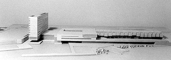 THE PLACE "A port is a place inasmuch as it is a space that is built out of experience, memory, learning and emotions. Its nature as a portal, as the limit between the city and the sea, make the port a place of maximum symbolic tension". The subject suggested was a hotel and palace of congresses on the site occupied by the Campsa tanks in the port of Alicante. The project was approached as an attempt to reuse a space for cultural and leisure activities that would be useful and revitalising for the city, would live alongside the existing yacht club and fishing ports and would preserve the great richness of meanings that the port, as a place, has built up in the collective memory of the city's inhabitants. An urban square with reminiscences of the port seeks to bring the sea and the city closer to each other and becomes the end of the axis of Avenida Oscar Esplá. This maritime square sets up a dialogue between the three buitdings placed around it: the old Murcia Station, the Palace of Congresses and the Hotel to service it. We saw the sea as a key element that the city wants to make its own. In the case of Alicante, the sea is steadily being moved further away whereas in the 19th century it practically bathed the old Murcia station, hence our intention of bringing it back. The overall arrangement attempts to provide an answer to the borderline site, emphasising the seawards façade so that it can be seen from a distance. A tranquil impression is sought, hence the only landmark is the tower of hotel rooms while the rest of the hotel and the palace are worked out horizontally. The whole is placed on the unifying plinth of the coastal shelf. The difference in scale between the congress building and the hotel tower is tempered by placing the services building between them. Rather than using the Elche road, a service road for wheeled access is created parallel to the avenue leading to the city. It leads off towards the two buildings, passing underground and reemerging after serving both. The paving is natural stone. Its straight double line seeks to reinforce the opposing directions of the two parts and enhance a space that can be used for different purposes. The hotel and the palace are placed in this area without a perimeter like the ends of two major axes of the city of Alicante. The Palace, a more compact body, constitutes the end of Avenida Oscar Esplá, within the consolidated layout of the port, while the Hotel, in the neighbourhood of the beach, with a freer structure of bodies that are joined up in a more organic way, ís the finishing point of the Parque de Canalejas. As an antechamber to the city, a garden is also proposed. This would descend from the Benalúa quarter, higher up, and link the city and the sea both physically and visually. The station, which could be reused as an administrative building, acquires its own prominence as the link between the two spaces. |