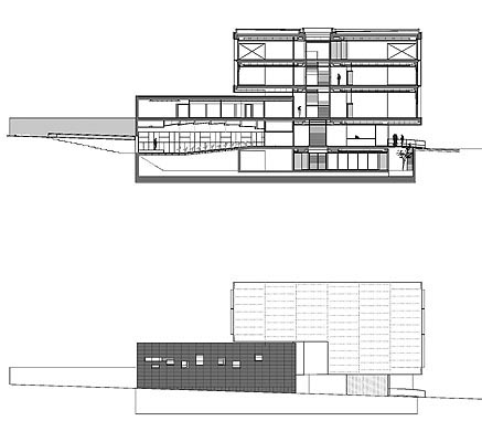 El Proyecto se plantea desde el reconocimiento de la necesidad de asumir el compromiso social que la Universidad debe de tener con la Sociedad en la que reside. Proponemos un edificio que sea capaz de transmitir un imagen nítida y diferenciada en el Campus. Un edificio que articule sus actividades y las ponga al servicio de la Sociedad ... Aceptamos la trama reticular del Campus como elemento ordenador del proyecto. Nuestra parcela se encuentra en el límite del recinto universitario y tiene una traza triangular provocada por un reajuste en el perímetro del lado Norte del Campus. Se trata de una parcela residual. El edificio se ajusta a la alineación ortogonal definida por los lados Sur y Este de la parcela, dejando un patio triangular en el Norte. Proponemos, por tanto, dos volúmenes perpendiculares que se encuentran en el vértice S-E de la parcela reforzando su único ángulo recto: en ese punto ubicamos el acceso. Los dos volúmenes están perfectamente diferenciados, tanto por su dimensión como por su definición material. El de menor altura se ajusta a la calle longitudinal (Sur) que es paralela al boulevard y se materializa mediante un revestimiento de placas de gres porcelánico (1,20x0,60 m) de color negro y textura mate y lisa. El volumen de dimensión mayor se apoya en el anterior y se gira sobre el lado Este para mostrar la fachada de mayor altura como el frente principal del conjunto. En este caso se materializa con un revestimiento de planchas de aluminio anodizado en su color natural para definir los testeros Norte y Sur y un sistema de planos acristalados con una protección de lamas de paneles de aluminio verticales que configuran las fachadas Este y Oeste. El conjunto volumétrico se percibe claramente diferenciado destacando sobre la contundencia ciega del volumen negro la ligereza de las fachadas Este (tres alturas) y Oeste (dos alturas), que vibran debido al sistema de combinación de las lamas verticales en el que se ha incorporado de forma aleatoria el color rojo del logotipo de la Universidad de Castellón. b. Desde el Programa Desde el punto de vista estrictamente funcional, los dos volúmenes diferenciados corresponden a las distintas agrupaciones de actividades del complejo programa del edificio. En el volumen negro se ubican todas las actividades relacionadas con la Institución (salón de actos, sala de reuniones, oficinas del Consejo Social, etc..); en el volumen metálico se articulan todas las actividades de Postgrado (seriación de aulas, seminarios y tutorías). Estas actividades docentes se distribuyen a ambos lados de un estrecho patio longitudinal acristalado de tres metros de anchura - paralelo a la fachada principal y abierto al Norte - donde se alojan las escaleras y los vacíos de comunicación visual entre los distintos niveles. Debido a su estratégica ubicación y a su transparencia, el interior del edificio se percibe como un complejo sistema de relaciones en el que las escaleras adquieren un significado especial como mecanismo de comunicación y articulación vertical del conjunto. El patio triangular definido por la articulación de los dos volúmenes queda en la planta primera y se vincula directamente a las actividades del Consejo Social. |