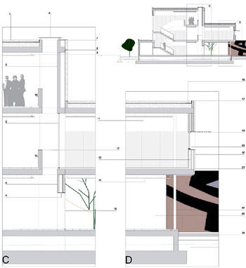 1. Cubierta plana. Hormigón aligerado para formación de pendientes, aislante térmico de poliestireno estruído de alta densidad e= 4 cm, lámina de impermeabilización autoprotegida de PVC de 1,2 mm, fieltro separador no tejido, capa de gravas filtrantes (Ø 5- 20 mm); e medio = 5cm/Flat roof. Lightweight concrete to create slope, high-density extruded polystyrene thermal insulation t = 4 cm, PVC waterproof membrane with built-in protection t = 1.2 mm, non-woven separator felt, layer of filtering gravel (Ø 5-20 mm); avg t = 5 cm 2. Intradós lucernario. Panelado tipo Pladur sobre rastreles de madera directamente anclados a fábrica L12; acabado pintura blanca lisa/Skylight intrados. Plasterboard panel on wood battens fastened directly to L12 fabric; plain white paint finish 3. Cerramiento interior biblioteca. Láminas de vidrio colado traslúcido (u-glas), armado formando cámara sobre bastidores de aluminio/Interior wall of library. Sheets of translucent reinforced cast glass (U-glas), forming air chamber, on aluminium frame 4. Intradós lucernario. Panelado tipo pladur sobre rastreles de madera directamente anclados a fábrica L12, acabado pintura blanca lisa/Skylight intrados. Plasterboard panel on wood battens fastened directly to L12 fabric; plain white paint finish 5. Dintel. Tirantes de acero colgados cada metro de la cara inferior de forjado para sujeción de platabanda horizontal (cargadero ) de acero (e=1cm)/Lintel. Steel hangers from slab soffit at one-metre intervals to sustain steel breastsummer (t = 1 cm) 6. Lucernario. Vidrios laminados (stadip 4 + 4 con butiral traslúcido o transparente) directamente encastrados en bastidor de perfiles aluminio anodizados (2,5 micras) con gomas de ajuste, montados directamente sobre sub-estructura auxiliar/Skylight. Laminated glazing (Stadip 4 + 4 with translucent or transparent PVB) inserted directly into frame of anodised (2.5 micra) aluminium sections with gaskets mounted directly onto ancillary sub-structure 7.Remate de plancha de aluminio anodizado e=3mm/ Edging. Anodised aluminium plate t = 3 mm 8. Angular metálico para sujeción de fábrica L 120 x 120 x 5 mm/Metal hanger to sustain fabric, L 120 x 120 x 5 mm 9. Luminarias. Fluorescente continuo y direccional/ Lighting. Directional fluorescent strip 10. DM/MDF 11. Falso techo interior. Placas lisas de cartón-yeso sobre estructura tubular oculta auxiliar tipo Pladur, acabado pintura plástica lisa, color blanco/Interior suspended ceiling Smooth plasterboard panels on concealed hollow section structure (Pladur type), plain white acrylic paint finish 12. Barandilla. Vidrio laminar stadip 5 + 5 sobre bastidor metálico para protección de pasarela de religa/Railing. Stadip 5+5 laminated glass on metal frame protecting grating-floored gangway 13. Revestimientos interiores. Panelado de tableros DM directamente cogidos a fábrica mediante rastreles de madera, siendo el de base de madera maciza de iroco formando rodapié e=4 cm/Interior linings. DMF panelling attached to fabric directly by wood battens, base batten solid iroko wood forming skirting t = 4 cm 14. Falso techo exterior. Placas lisas de cartón-yeso sobre estructura tubular oculta auxiliar tipo WR (repelente de agua) tratado con siliconas y acabado pintura plástica lisa, color blanco/Exterior suspended ceiling. Smooth plasterboard panels on concealed hollow section structure, WR (water repellent) type, treated with silicone; plain white acrylic paint finish 15. Carpintería exterior. Vidrio fijo de seguridad 6 + 6 mm sobre perfilería de aluminio anodizado para salida a porche/Exterior joinery. Fixed pane of 6+6 mm security glass on anodised aluminium joinery for exit to portico 16. Cubierta plana invertida. Hormigón aligerado para formación de pendientes, lámina de impermeabilización autoprotegida de PVC de 1,2 mm, aislante térmico de poliestireno estruído de alta densidad e= 4cm, fieltro separador no tejido, capa de gravas filtrantes (Ø 5 - 20mm); e medio = 5 cm/Inverted flat roof. Lightweight concrete to create slope, PVC waterproof membrane with built-in protection t = 1.2 mm, high-density extruded polystyrene thermal insulation t = 4 cm, non-woven separator felt, layer of filtering gravel (Ø 5 - 20mm); avg t = 5 cm 17. Albardilla. Chapa conformada de aluminio anodizado 35 micras, e=2mm/Coping. Shaped sheet of anodised aluminium, 35 micra, t = 2 mm 18. Parasol. Módulos prefabricados de malla electrosellada de pletinas galvanizadas de 4 mm, dispuestas verticalmente cada 40 mm, formando una retícula de 40 x 40 mm, sobre bastidores del mismo material, atornillados directamente a dintel/Brise-soleil. Prefabricated modules of electrowelded mesh of 4 mm galvanised bars placed vertically at 40 mm intervals forming a 40 x 40 mm grid, on a frame of the same material screwed directly to the lintel 19. Ventanal corredero de perfilería de aluminio anodizado sobre bastidores del mismo material 95 x 40 5 mm, climalit 6.6.6/Sliding window. Anodised aluminium joinery, on 95 x 40.5 mm frame of the same material, Climalit 6+6+6 double glazing 20. Vierteaguas + jambas. Chapa conformada da aluminio anodizado 35 micras, e=2mm/Sill + jambs. Shaped sheet of anodised aluminium, 35 micra, t = 2 mm 21. Fachada. Doble fábrica de ladrillo (exterior panal de 1/2 pie e interior L7) revestida interiormente con tablero DM sobre rastreles, aislamiento térmico proyectado (poliuretano espandido e=3cm) - cámara de aire- lámina interna de ladrillo hueco del 7, revestimiento exterior de panelado de placas compactas (225 x 186 cm) de material sintético obtenidas a base de resinas termoendurecibles, homogéneamente reforzadas con fibra de celulosa y color integrado al material (cara exterior) fijado a la fábrica sobre rastreles de madera (tipo Trespa)/Façade. Brick cavity wall: outer leaf ‘1/2-foot’ perforated brick lined with MDF on battens, sprayed thermal insulation (expanded polyurethanee t = 3 cm) - air cavity - interior leaf of