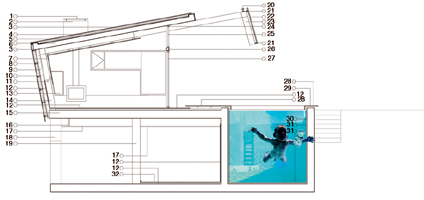 23. Viga de acero ipe 200/Steel beam, IPE 200 24. Marco de aluminio color plata.4 cm/Frame, silver-coloured aluminium, 4 cm 25. Vidrio laminar de seguridad 6+6/Laminated security glass, 6+6 26. Dintel de acero #100x100 lacado en negro mate/Steel lintel, size 100x100, lacquered matt black 27. Puerta corredera de aluminio color plata/Sliding door, silver-coloured aluminium 28. Entarimado de madera ipé de 2 cm atornillada a rastreles de pino cuperizado 40x40/Decking, 2 cm ipe wood screwed to 40x40 copper naphthenate treated pinewood joists 29. Muro de contención de h.a./Retaining wall, reinforced concrete 30. Gunitado de 10 cm/Sprayed cement mortar, 10 cm 31. Revestimiento de gresite sobre cemento cola/Gresite tiles fixed with cement-based adhesive 32. Hormigón nivelante 5 cm/Levelling concrete, 5 cm