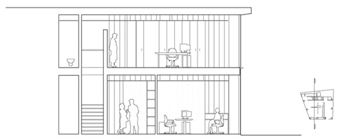 Sede del Colegio de Arquitectos. Por tanto, como tarea primordial se fija aportar ese nivel de calidad requerido para impulsar operaciones similares que devuelvan a la zona la actividad urbana y dignidad que precisa. El local presenta una forma trapezoidal con 3 fachadas, siendo el cuarto lado, el más irregular, medianero con el portal de las viviendas. La propiedad solicita concentrar el programa de uso permanente en planta baja, mediante un área de atención al público, 2 despachos y archivos, de manera que la entreplanta quede reservada a usos esporádicos (sala de juntas, despacho auxiliar, aseos, archivo e instalaciones). Para ello, en primer lugar regularizamos el espacio en planta situando el núcleo de comunicaciones paralelo a la fachada principal, dejando los espacios sobrantes destinados a servicios y archivos. Mediante una sencilla operación geométrica resolvemos la organización del programa en planta: una cruz formada por un mueble contenedor y un paramento de vidrio, que gira ortogonalmente su posición en la entreplanta, respecto de la planta baja, resuelven en cada nivel el programa requerido. Procuramos un espacio básicamente diáfano, que aporte las condiciones adecuadas de relación con el usuario, de funcionalidad y también de grado de privacidad que se exigen en este tipo de entidades. En consecuencia decidimos envolver el espacio disponible mediante unos acristalamientos resueltos a base de vidrios traslúcidos y transparentes, que nos permitirán un grado suficiente de privacidad y también una relación medida con el espacio exterior. En esta ocasión se potencia la presencia de la vegetación de la Plaza Gabriel Miró, que se hará visible desde el interior, tanto desde la planta baja como desde la entreplanta, a través de las tiras de vidrio transparente estratégicamente situadas. Cuidamos la elección de materiales, su ajuste y su disposición para, en coherencia con su situación urbana, conseguir un espacio que ayude a identificar esta institución. |
