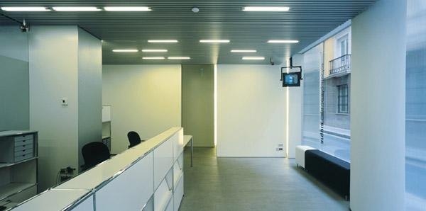 The commercial premises to be refurbished for the Architects Savings Bank are small and are located on 2 floors in a block of flats built in the 1970s, in a somewhat run-down urban area where the environmental quality is improving following the recent establishment in the vicinity of the local College of Architect headquarters. Consequently, it was decided that the paramount task was to achieve a level of quality that would encourage similar operations to reinvigorate and upgrade the area. The premises are trapezoidal and present 3 frontages. The fourth side, the most irregular, is the party wall with the entrance hall of the block of flats. The owner asked for the permanent use areas to be placed on the ground floor, namely a customer service area, 2 offices and filing facilities, reserving the mezzanine for sporadic use (board room, additional office, toilets, filing room and plant room). The first step was to make the ground floor space more regular by placing the stairs and lift parallel to the main façade, using the left-over spaces for building services and filing. A simple geometrical figure organises the floor plan: a cross formed by a cupboard unit and a glass partition solves the layout of the brief on each floor. On the mezzanine it is set at a right angle to its ground-floor position. The idea is an essentially open space which provides suitable conditions for attending to customers, for functionality and also for the degree of privacy required in a banking establishment. It was therefore decided to wrap the available space in translucent and transparent glazing, to give both a sufficient degree of privacy and a measure of relation with the exterior. Here, it highlights the vegetation in Plaza Gabriel Miró, which can be seen from the interior, on both storeys, through the strategically placed bands of transparent glass. The choice, fit and arrangement of the materials were made with great care, in keeping with its urban location, to achieve a space that would help to identify the bank. |