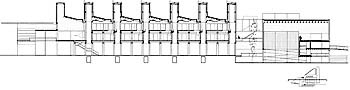 In the interior of the building, particularly on the ground floor, the structure forms a large columnated space. It has an isotropic quality, as the pillars are placed on an almost symmetrical orthogonal grid with 4 m spaces between the pillars N-S and, E-W, a repeated sequence of two 4 m bays followed by a 2.5 m bay with a concrete joint in its centre. The crux of the problem was that in order to use the Docks as a school without changing the original floor plan, in other words without 'touching' a single pillar, I had to find a way to bring naturallighting and ventilation into the interior of the two storeys. The solution makes the intended use of the Docks building as a school compatible with the original structure by piercing the 2.5 metre bays where the concrete joints are located in order to make 'wells' that light and ventilate the great hypostyle on the ground floor and perform the same purpose laterally for the first floor of the building and the proposed new storey. The reason is that these are the floors which are most difficult to convert in a natural way without resorting to removing part of the floors and making interior courtyards to give the interior of the building naturallight and ventilation. |