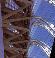 The position of the museum building is at one end of the city of arts and sciences complex. Like the giant pavilions of the great exhibitions of the past, a longitudinal building is generated by the modular repetition of its cross-section over the entire length of the plot assigned to it. The ends of the building take on a quality of symmetrical finish, giving an image of tensing, of securing the repeated modules in the manner of lateral buttresses. The building takes the form of a vast roof supported by a transparent glazed north façade and a suitably opaque south façade, both of which respond to the specific sunlight conditions of Valencia for the direction they face. The internal structure of the building, which externally forms the great roof, is organised in a spectacular play of platforms that hang from the structural system. This is composed of five great concrete trees and their branches, which secure the covering of the building. |