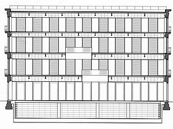 Q.01 roof: air-entrained concrete, cement mortar levelling screed, geotextile felt, dpm of PVC reinforced with fibreglass fabric, geotextile felt, 40 mm extruded polystyrene, 5 cm gravel (Ø 15/30 mm) Q.02 enamel-painted galvanised steel fascia, double 40 mm extruded polystyrene, 2 mm galvanised steel flashing over roof edge Q.03 top storey roof: air-entrained concrete, cement mortar levelling screed, geotextile felt, dpm of PVC reinforced with fibreglass fabric, geotextile felt, 40 mm extruded polystyrene, iroko decking on copper-naphthenate-treated pine joists. Q.04 façade entablature: cornice and frieze in 3 cm thick sanded cream levante limestone fixed with cement mortar, enamel-painted galvanised metal railing comprising tubular section (Ø 20 mm) handrail and posts. Q.05 housing: perforated brick fabric rough rendered, cement mortar floated and painted, galvanised steel cowl. F.01 rehabilitated façade: stone parts and facings repaired with some replacement of sandstone with special mortars, water jet cleaning and a hardening and water-repellent treatment to protect surfaces, existing render to masonry walls repaired with special mortars, water jet cleaning and spray-applied silicate film to protect surfaces, wrought steel railings brush-abraded and protected with enamel paint. F.02 lining of existing façade walls comprising 20 cm reinforced concrete perimeter bearing wall finished with 15 mm plasterboard fixed to channels and painted with matt plastic paint, 60x15 mm iroko skirting mounted flush F.03 iroko wood joinery forming windows with a single opening pane (sliding in rooftop storey) with 3+3/12/4+4 mm glazing as per joinery detail, Gradstore 80 type external venetian blind, motor-driven, operated by buttons in window jamb, aluminium blind rails inset in iroko housing, iroko sill in interior window embrasure raised to skirting level. F.04 main entrance embrasure sides to receive pivoted door: double board of 25 mm iroko strips over 50x50 mm pine core structure enclosing 50 mm extruded polystyrene panels, iroko wood pivoted single leaf door, natural coconut floor covering F.05 rear wall overlooking centre-block: LH11 cellular brick rough rendered, lime and cement mortar floated and painted, 40 mm thick expanded polystyrene thermal insulation, air cavity, LH7 cellular brick lined directly with 15 mm plasterboard painted with matt plastic-based paint, flush iroko wood skirting 60x15 mm P.01 Stairway, lift and service installations core: bearing walls and solid reinforced concrete slab floors, external panelling 6 mm industrial anodised aluminium sheeting with concealed anchoring/adjustment system of galvanised steel channels and aluminium hooks welded to sheeting, staircase lined with 15 mm plasterboard fixed on channels. P.02 iroko wood floorboards 120 mm wide x 22 mm thick on 20 mm plywood sub-deck over 50x50 mm pine joists, water-based varnish sanded and finished with two coats of same varnish, pvc cable trays and junction boxes for electricity, telephone and computer cables under decking with iroko plank on box covers. Composite deck: steel sheeting 7+ 8 cm on steel beams, sprayed vermiculite fire protection. Suspended ceiling: 13 mm plasterboard on 47 mm metal channels every 40 cm attached to soffit by metal hangers. P.03 flooring: sky blue quartzite, sanded finish, length 100 cm, gauged thickness 2 cm, varying width (40, 60, 80 or 100 cm), dry joints, laid on sand and fixed with cement mortar. Concrete waffle slab floor with vermiculite fire protection sprayed on soffit. P.04 6+6 laminated glass partitions fixed into stainless steel channels in floor and ceiling, partition in suspended ceiling formed by double layer of 13 mm plasterboard on 34 mm galvanised steel sections. P.05 through floor void: parapet 8+8 mm laminated glass with no hand-rail anchored to steel-plate deck-breast, deck edged with 15 mm plasterboard glued to steel plate. IC.01 climate control: heat pump ducting units two per floor excepting rooftop storey (one), exterior units on roof, interior units in removable Luxalon 20 mm wide aluminium strip ceilings in toilets, controls in service cabinets per floor, supply through façade window lintels and linear diffusers with sheet metal plenum connected by flexible duct to main fibreboard duct, return through gap at meeting of suspended ceiling with stairwell at duct. C.01 façade wall footing underpinned by Jet Grouting system and waterproofed with layer of primer, cellular filtering membrane and gravel-filled drainage trench C.02 basement wall: 30 cm reinforced concrete bearing wall coated with waterproof mortars on inner face. C.03 reinforced concrete groundslab 70+10 cm thick, floor finish floated concrete mixed with fibrillated polyethylene fibre (900 gr./m3) with joints every 25 m2.